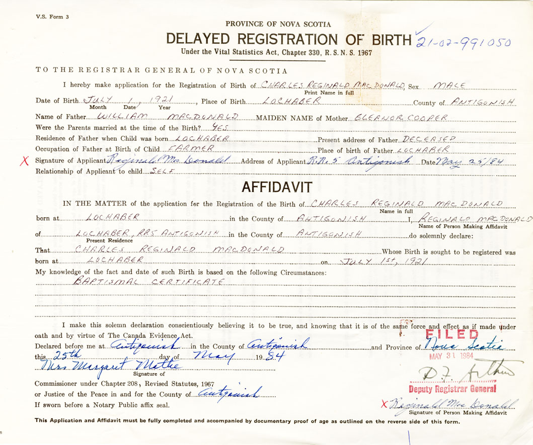 Date of Birth July 1, 1921 Place of Birth LochaberCounty of Antigonish