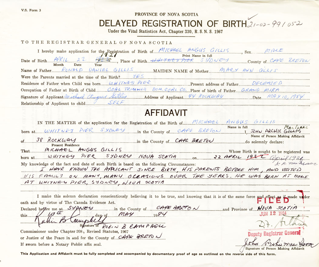 Signature of Applicant Michael Angus Gillis Address of Applicant 44 Rockway, Whitney Pier Date May 10, 1984