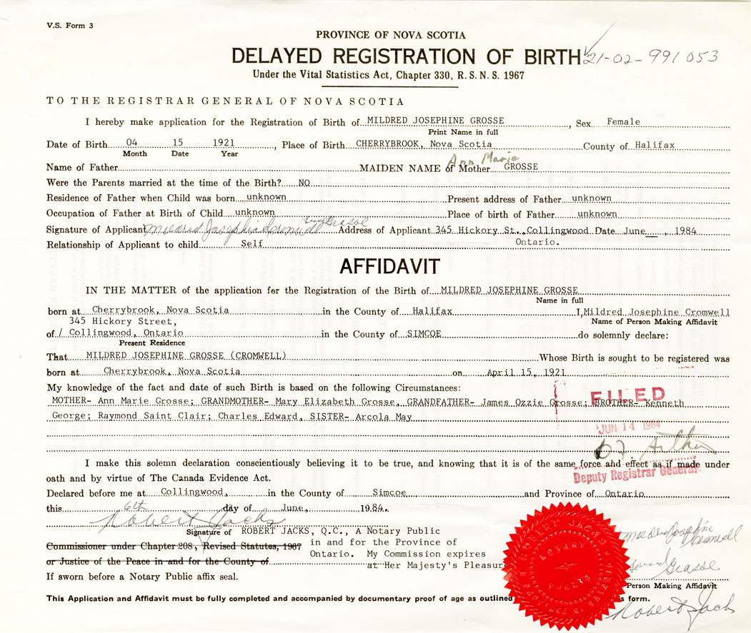 That Mildred JosephineGrosse Whose Birth is sought to be registered was
