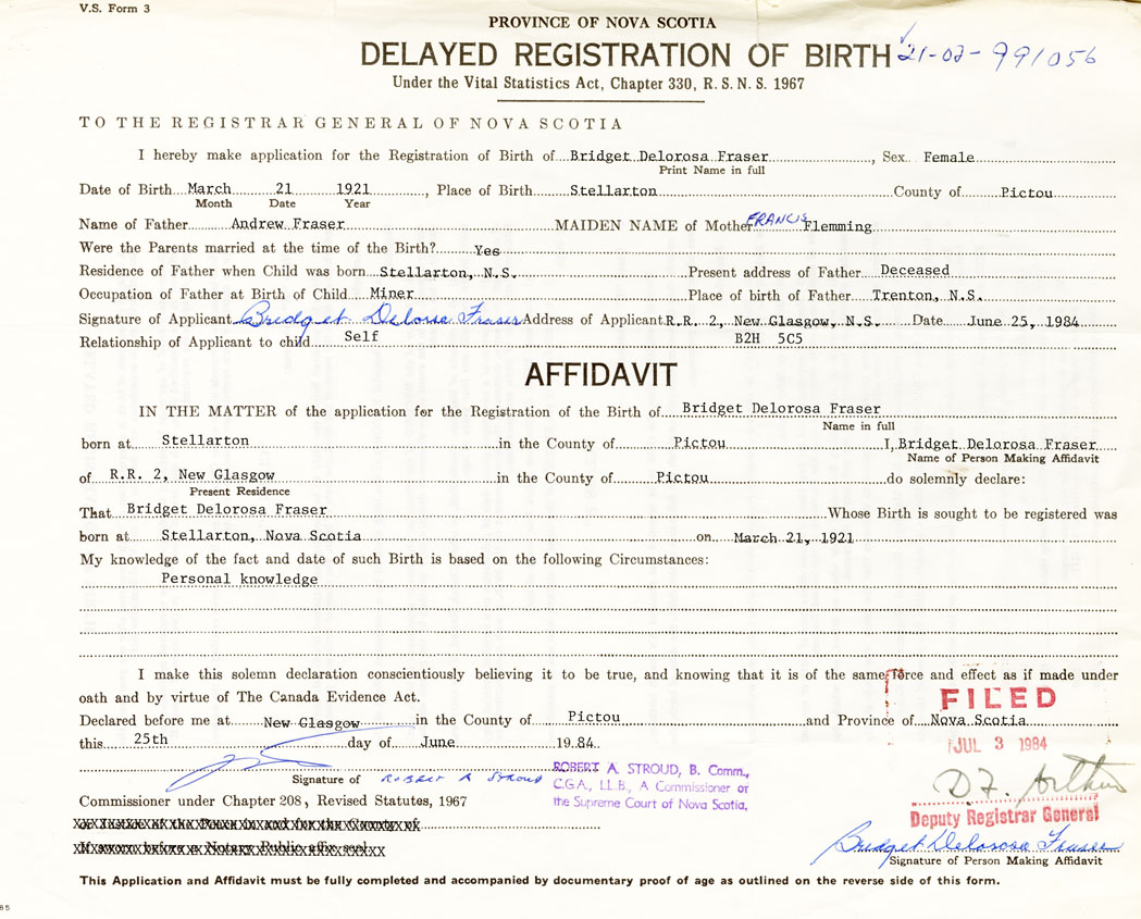 Signature of Applicant Bridget Delorosa Fraser Address of Applicant RR2 New Glasgow Date June 25, 1984