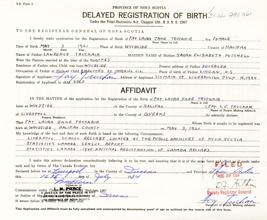 I hereby make application for the Registration of Birth of Fay Laura JaneTruckair Sex Female
