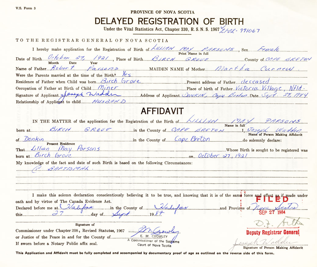 Date of Birth October 27, 1921 Place of Birth Birch GroveCounty of Cape Breton