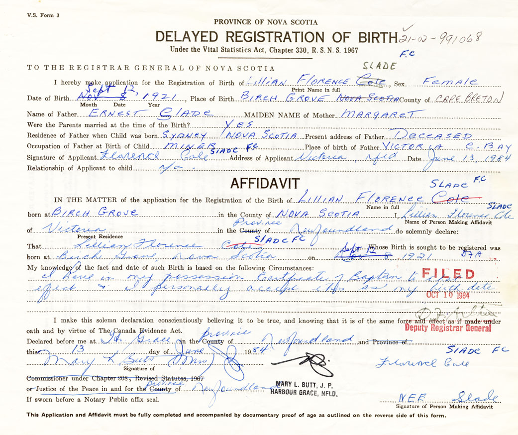 IN THE MATTER of the application for the Registration of the Birth of Lillian FlorenceSlade
