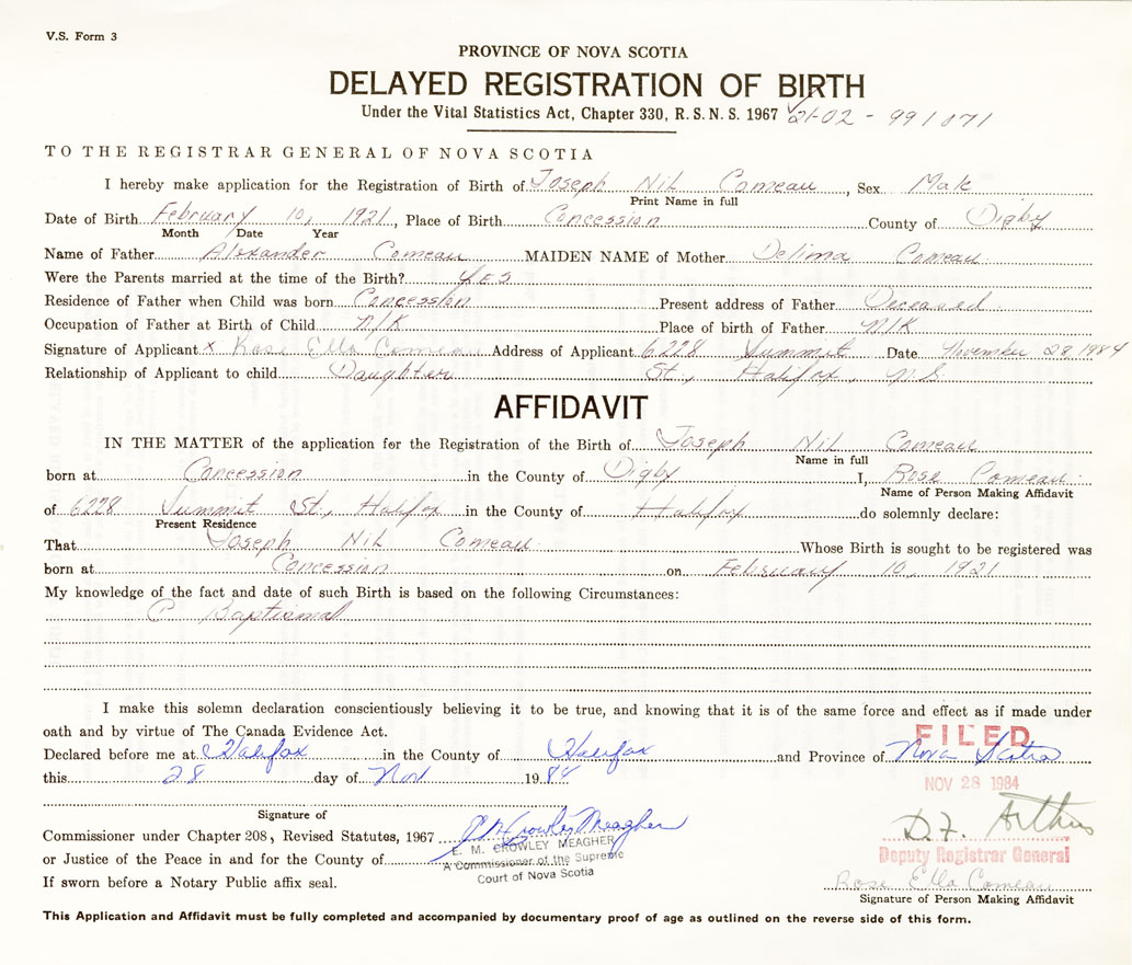 I hereby make application for the Registration of Birth of Joseph NilComeau Sex Male