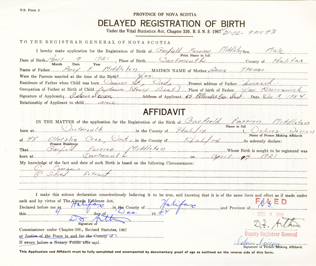 Date of Birth April 9, 1921 Place of Birth DarmouthCounty of Halifax