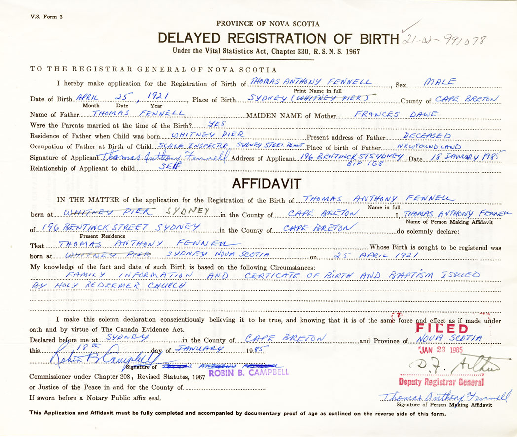 Date of Birth April 25, 1921 Place of Birth SydneyCounty of Cape Breton