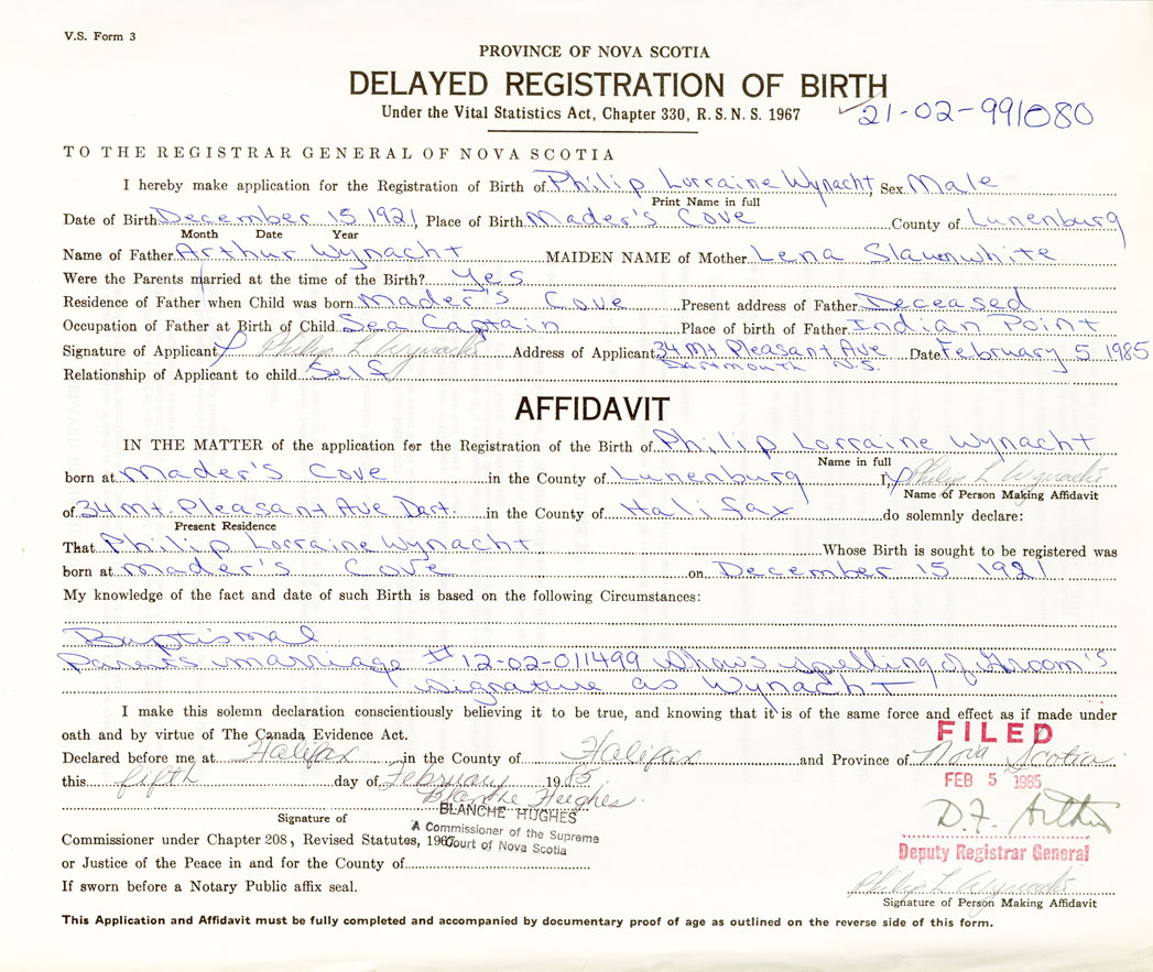I hereby make application for the Registration of Birth of Philip LorraineWynacht Sex Male