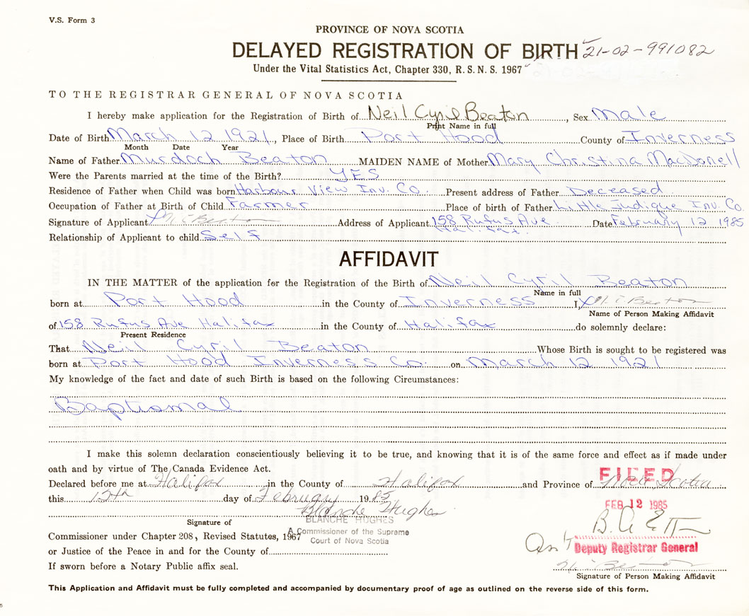 I hereby make application for the Registration of Birth of Neil CyrilBeaton Sex Male