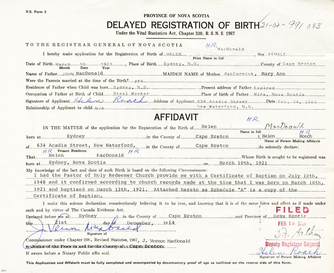 Date of Birth March 10, 1921 Place of Birth SydneyCounty of Cape Breton