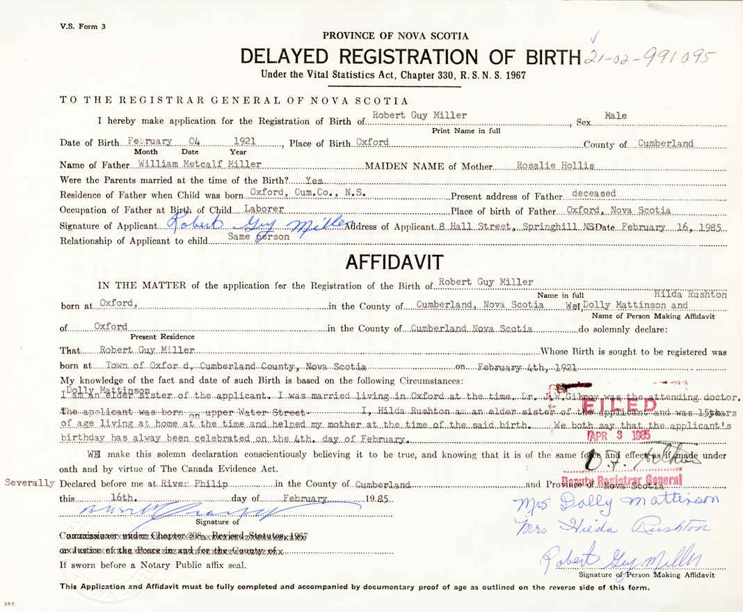 I Dolly Mattinson am an elder sister of the applicant. I was married living in Oxford at the time. Dr. J.W. Gilroy was the attending doctor. The applicant was born on upper Water Street. I, Hilda Ruston am an elder sister of the applicant and was 15 years of age living at home at the time and helped my mother at the time of the said birth. We both say that the applicants birthday has alway been celebrated on the 4th day of February.