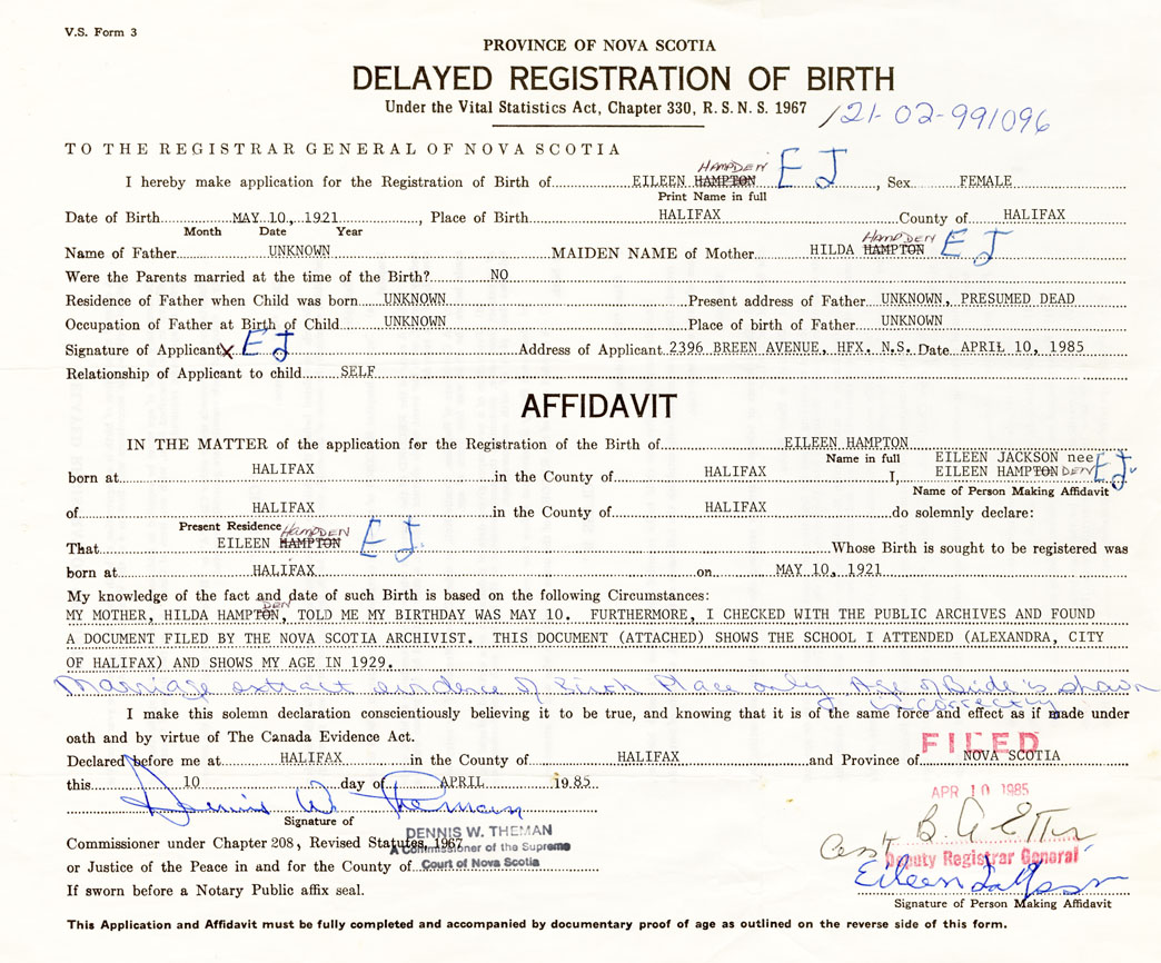 My mother, Hilda Hampden, told me my birthday was May 10. Furthermore, I check with the Public Archives and found a document filed by the Nova Scotia Archivist. This document (attached) shows the school I attended (Alexandra, City of Halifax) and shows my age in 1929. Marriage extract evidence of Birth Place only. Age of Bride is shown incorrectly