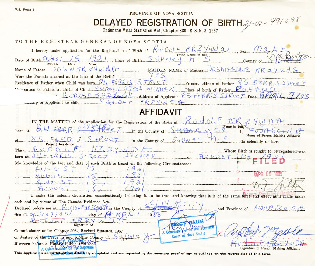 I hereby make application for the Registration of Birth of RudolfKrzywda Sex Male