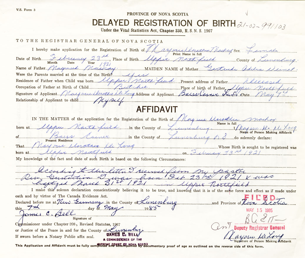 born at Upper Northfield Lunenburg County on February 23, 1921
