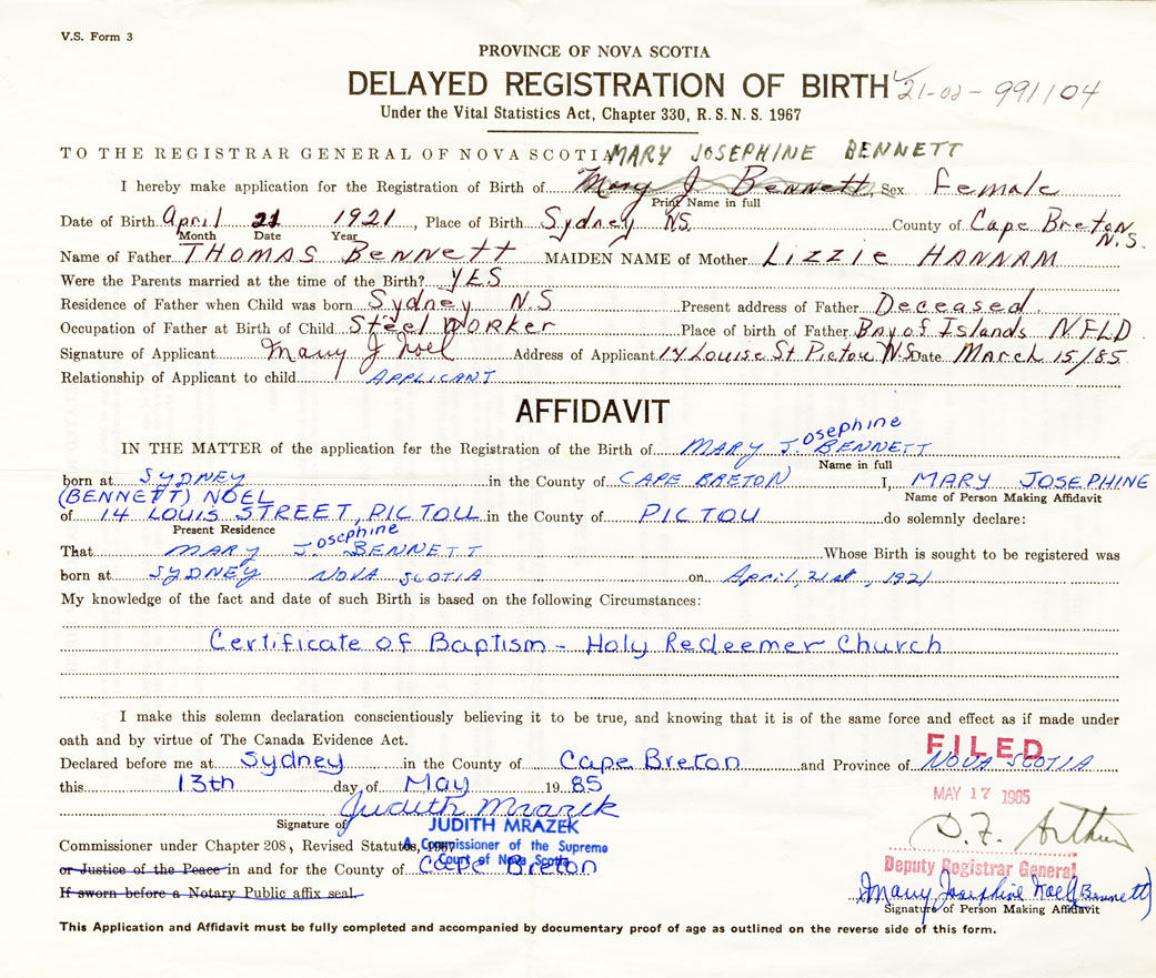 Date of Birth April 21, 1921 Place of Birth SydneyCounty of Cape Breton