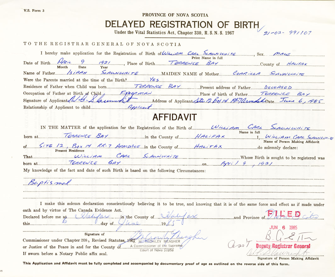 Date of Birth April 9, 1921 Place of Birth Terrence BayCounty of Halifax