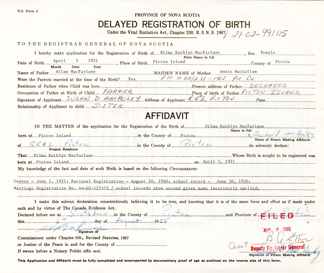 Signature of Applicant Susan D. MacAuley Address of Applicant RR2 Pictou Date August 1985