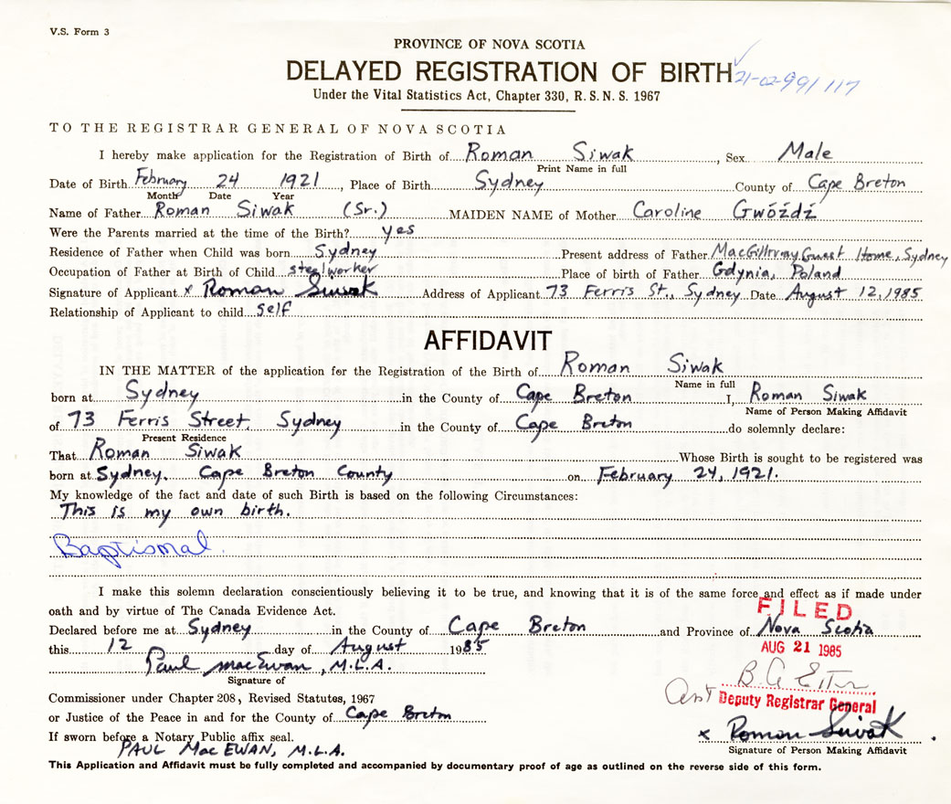 I hereby make application for the Registration of Birth of RomanSiwak Sex Male