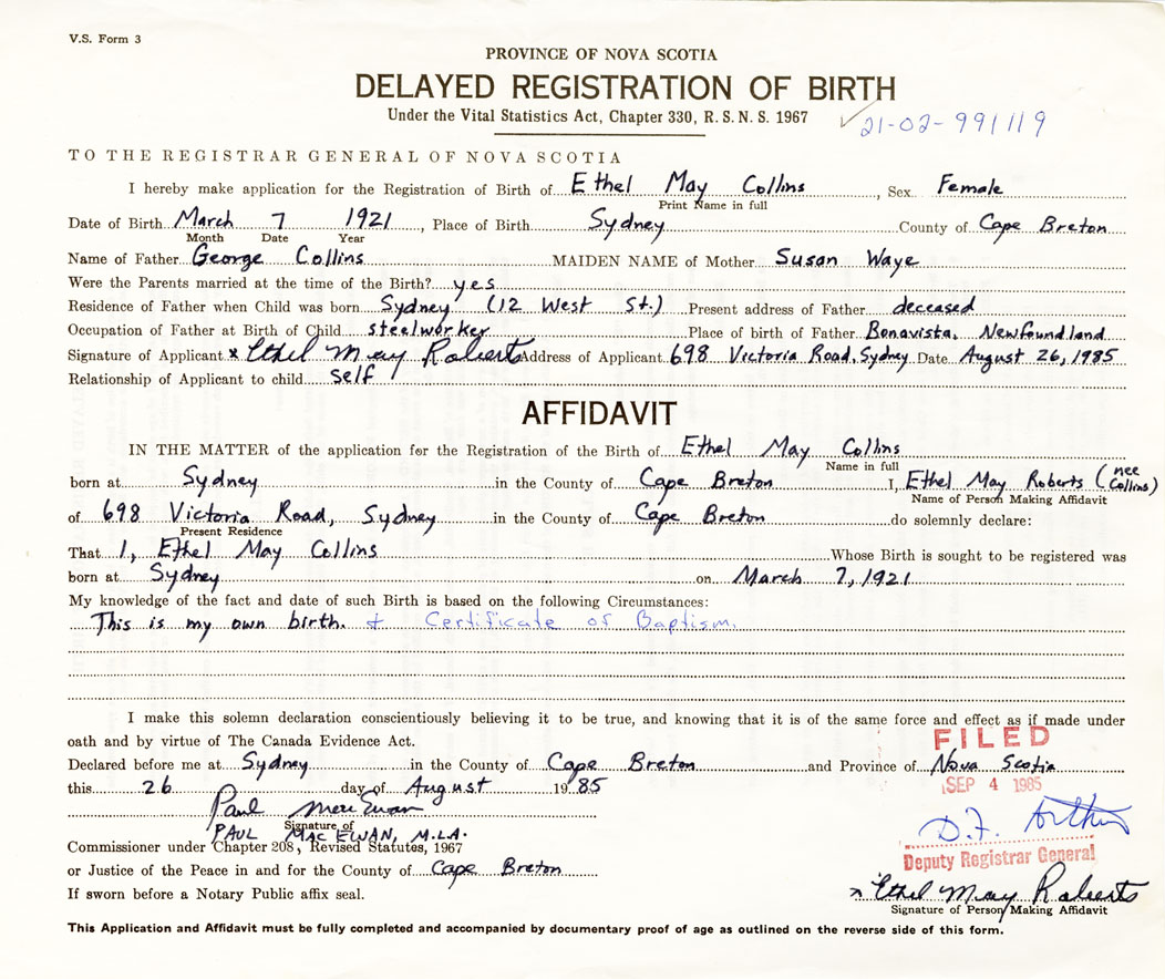 Date of Birth March 7, 1921 Place of Birth SydneyCounty of Cape Breton