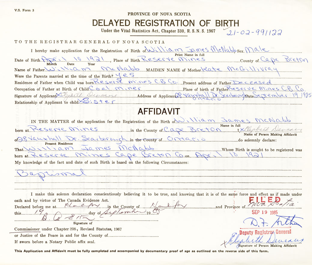 Date of Birth April 10, 1921 Place of Birth Reserve MinesCounty of Cape Breton