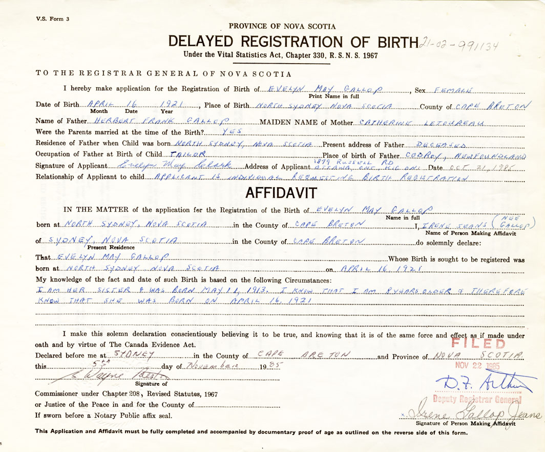 Date of Birth April 16, 1921 Place of Birth North SydneyCounty of Cape Breton