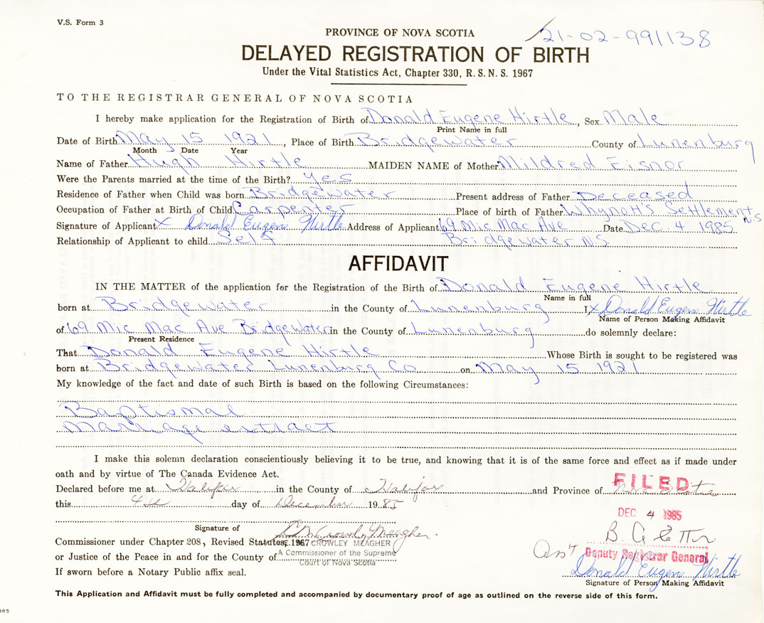 I hereby make application for the Registration of Birth of Donald EugeneHirtle Sex Male