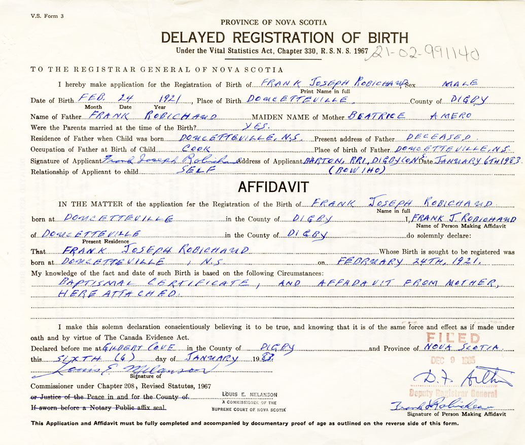 I hereby make application for the Registration of Birth of Frank JosephRobichaud Sex Male