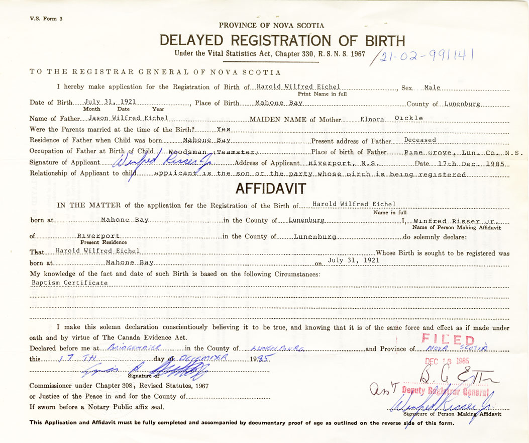 Date of Birth July 31, 1921 Place of Birth Mahone BayCounty of Lunenburg