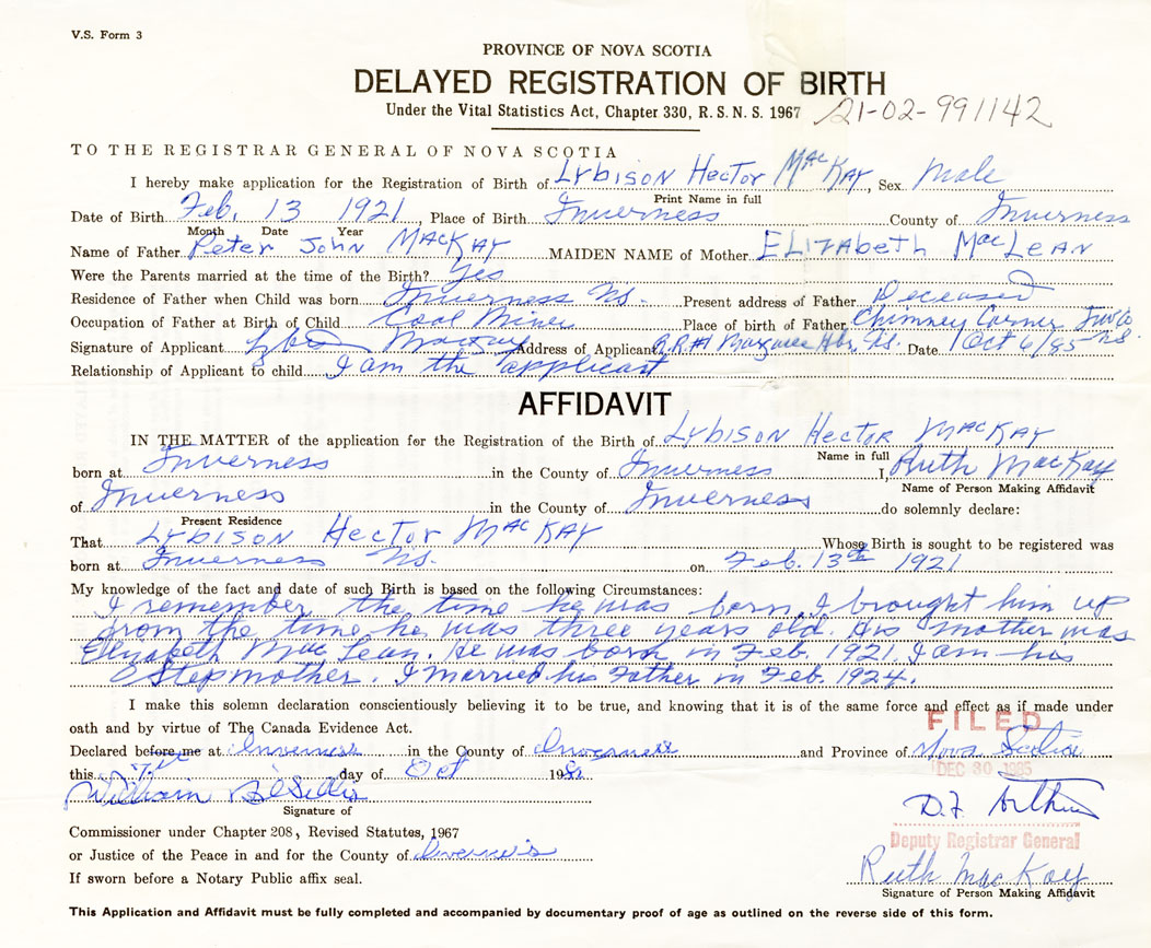 Name of Father Peter John MacKay MAIDEN NAME of Mother Elizabeth MacLean