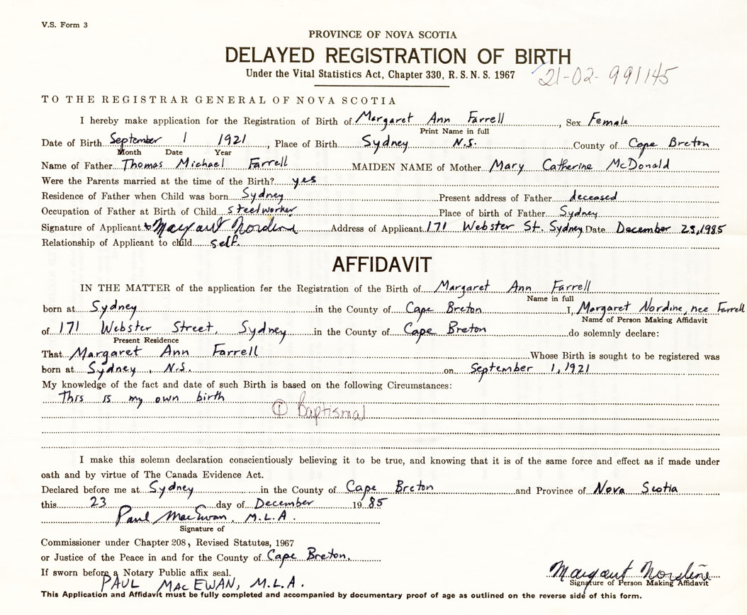 Date of Birth September 1, 1921 Place of Birth SydneyCounty of Cape Breton