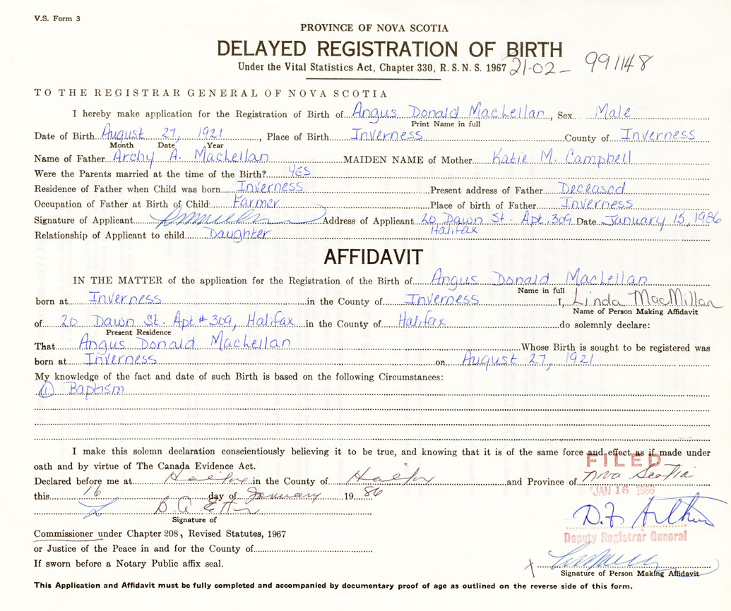 I hereby make application for the Registration of Birth of Angus DonaldMacLellan Sex Male