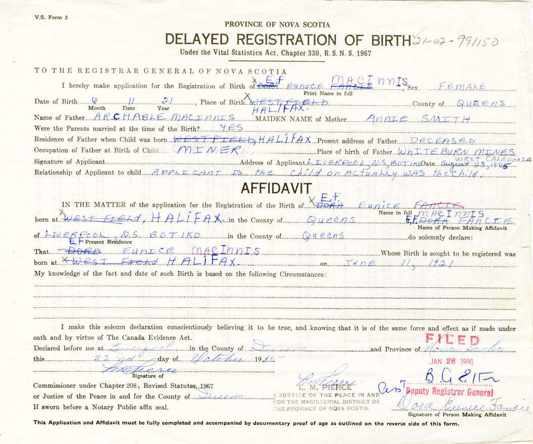I hereby make application for the Registration of Birth of EuniceMacInnis Sex Female
