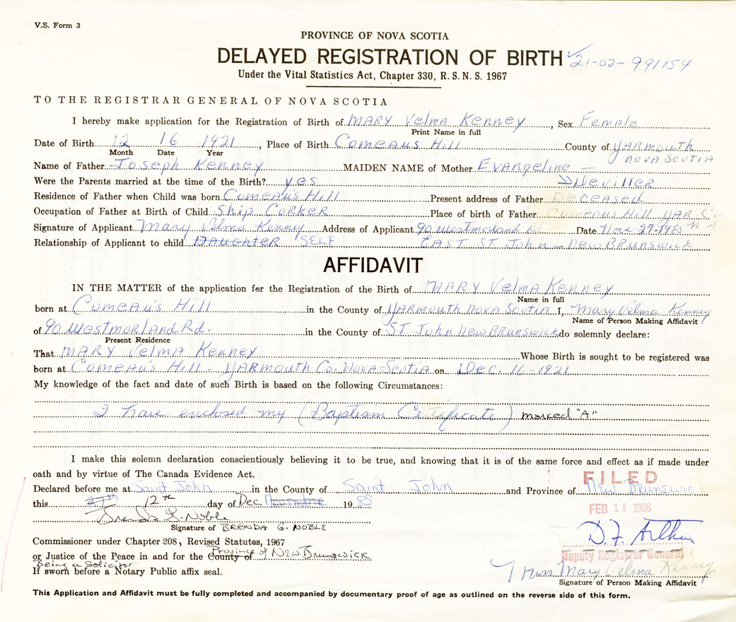 IN THE MATTER of the application for the Registration of the Birth of Mary VelmaKenney