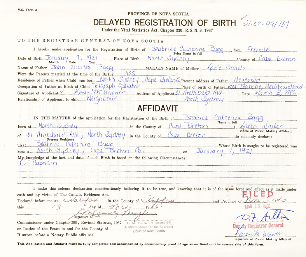IN THE MATTER of the application for the Registration of the Birth of Beatrice CatherineBagg