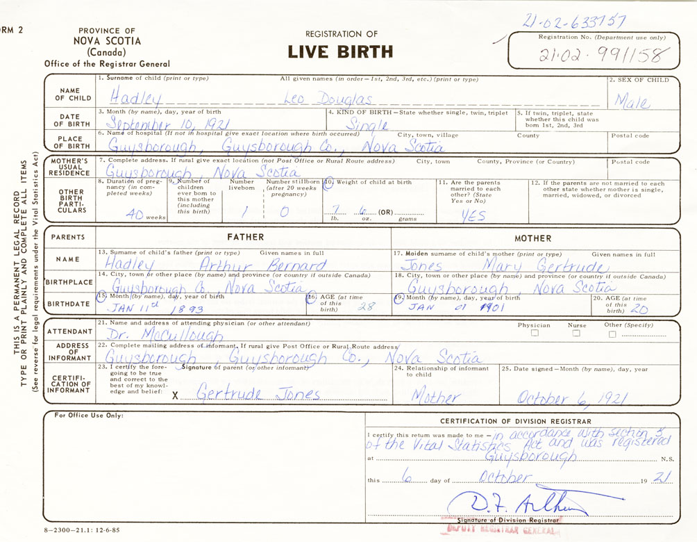 Date of Birth September 10, 1921 Place of Birth GuysboroughCounty of Guysborough