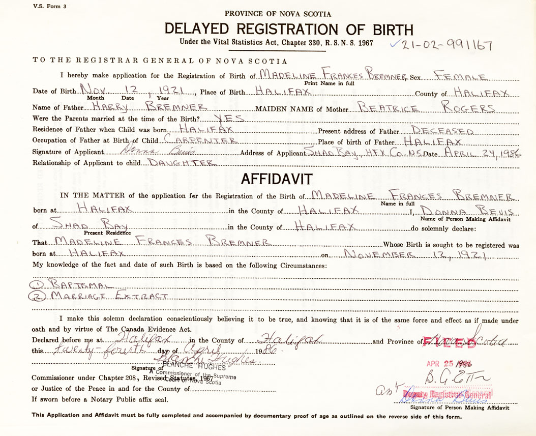 I hereby make application for the Registration of Birth of Madeline FrancesBremner Sex Female