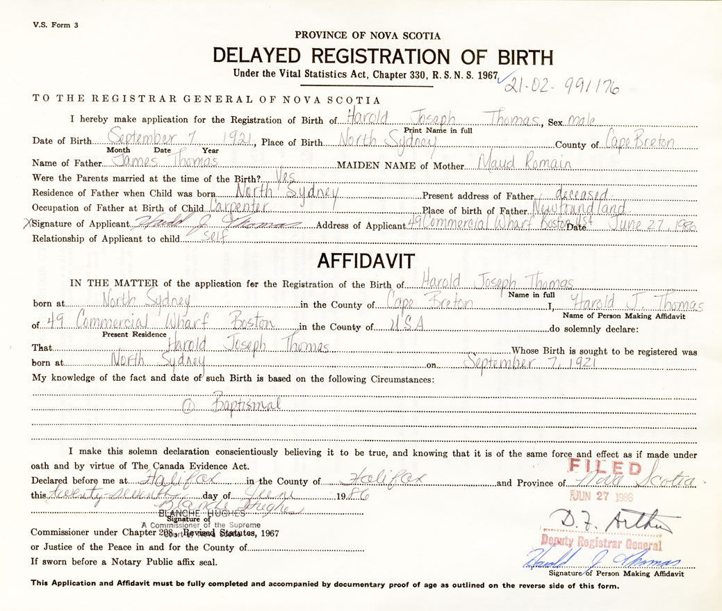 That Harold JosephThomas Whose Birth is sought to be registered was
