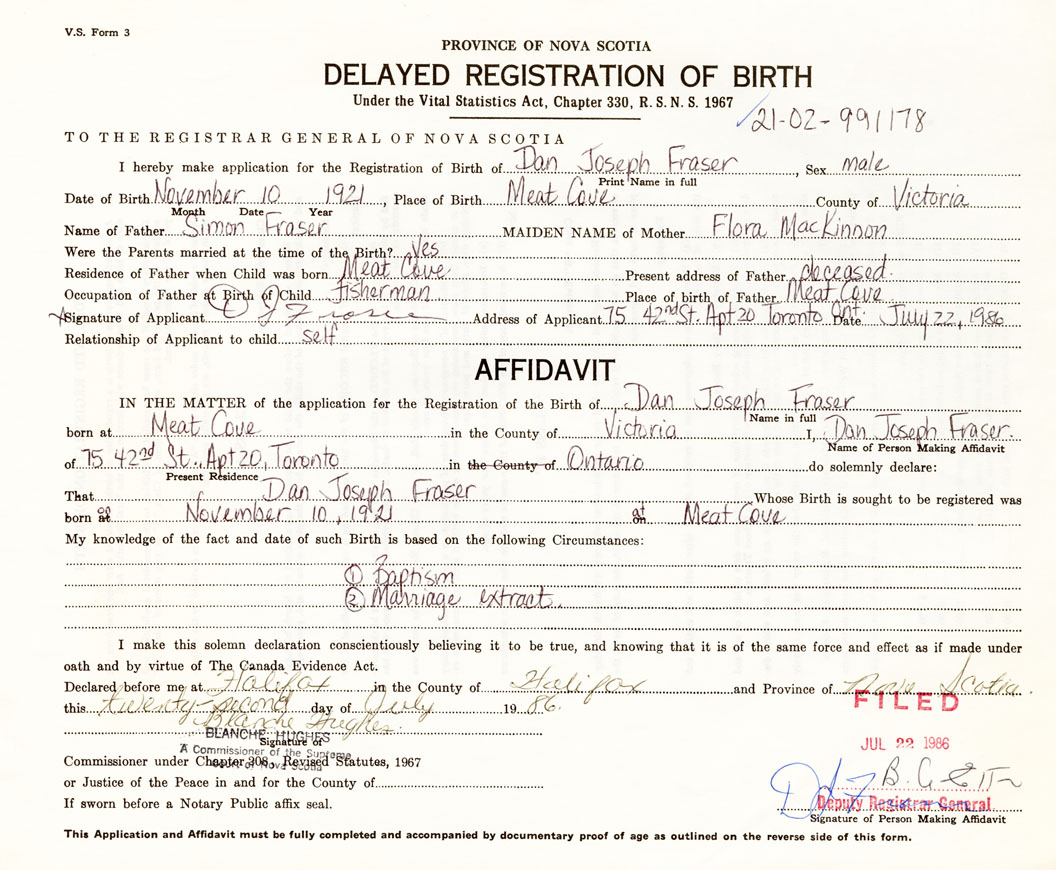 Date of Birth November 10, 1921 Place of Birth Meat CoveCounty of Victoria