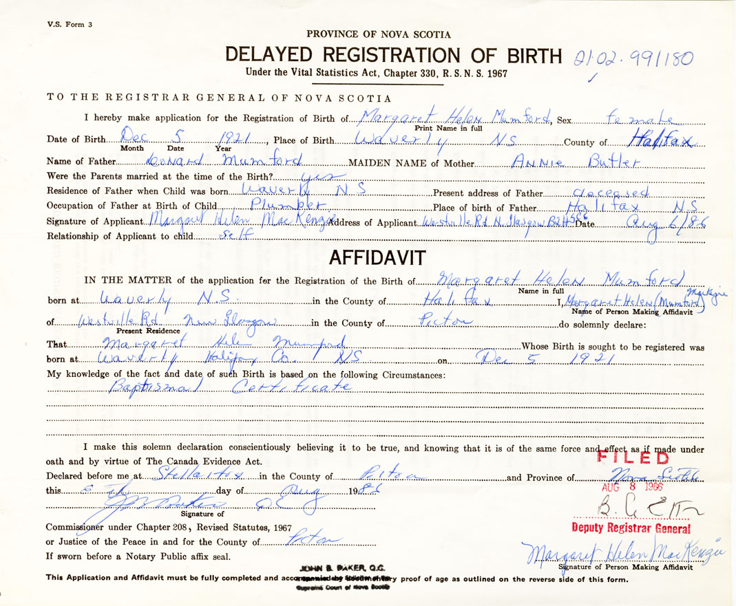 I hereby make application for the Registration of Birth of Margaret HelenMumford Sex Female