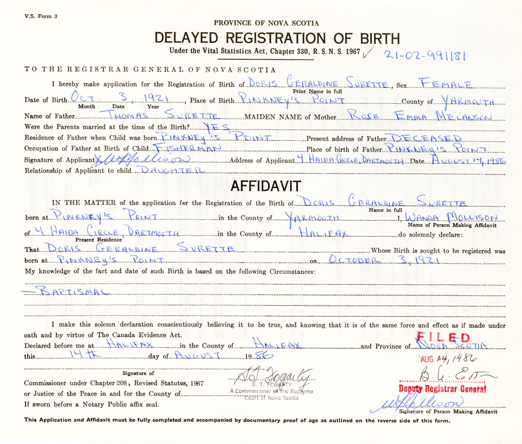 IN THE MATTER of the application for the Registration of the Birth of Doris GeraldineSurette