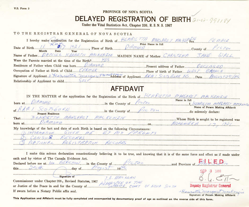 Signature of Applicant Henrietta Margaret MacKenzie Address of Applicant RR1 Scotsburn Date August 25, 1986