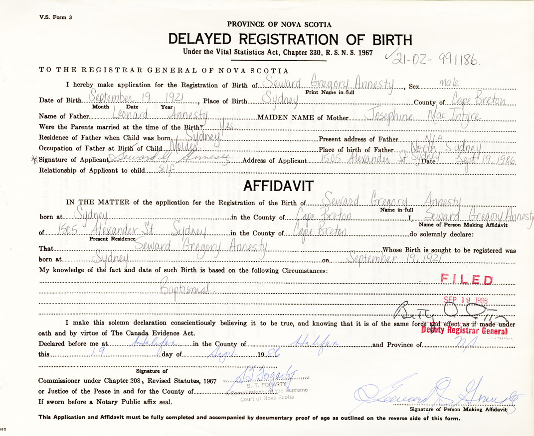 IN THE MATTER of the application for the Registration of the Birth of Seward GregoryAnnesty