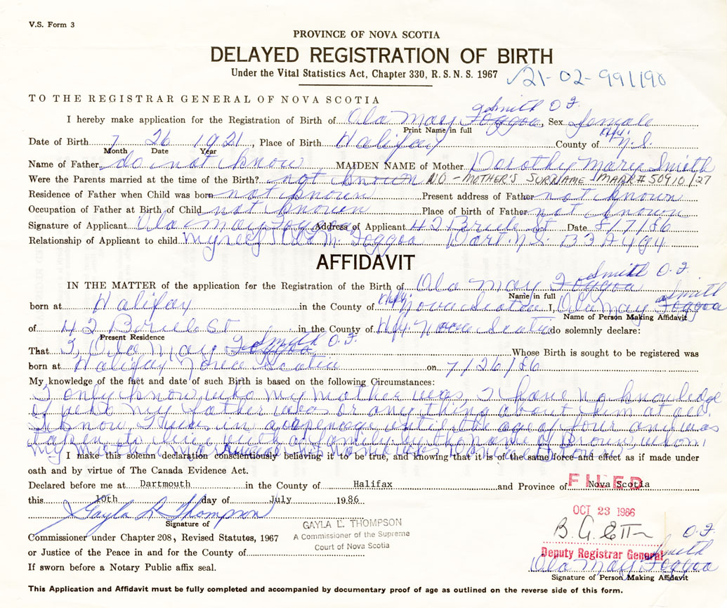 Signature of Applicant Ola May Foggoa Address of Applicant 42 Brule St. Dartmouth Date July 8, 1986