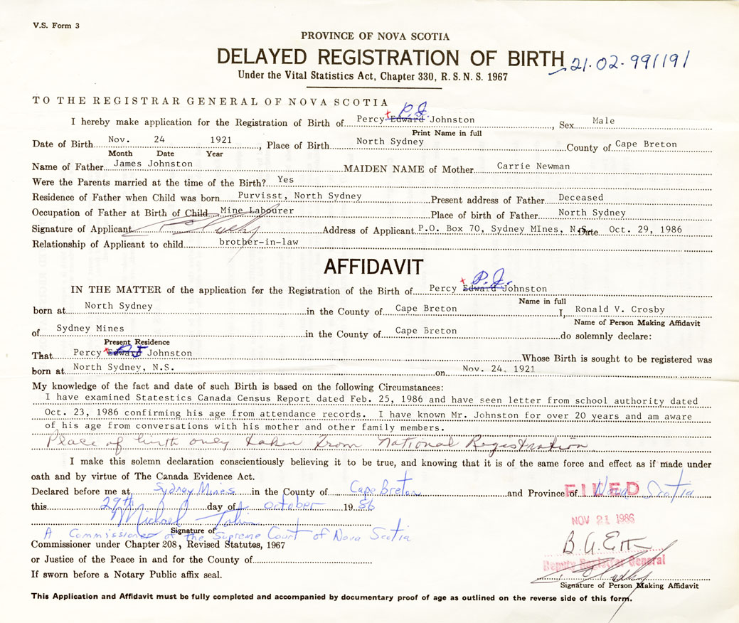 That PercyJohnston Whose Birth is sought to be registered was