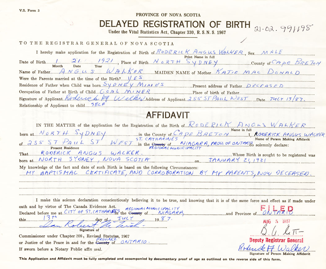 I hereby make application for the Registration of Birth of Roderick AngusWalker Sex Male