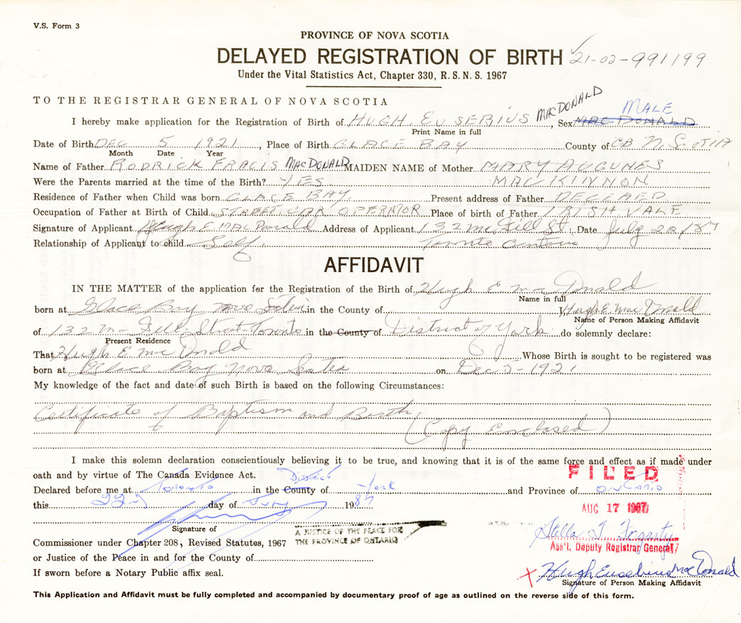 IN THE MATTER of the application for the Registration of the Birth of Hugh EvsebiusMacDonald
