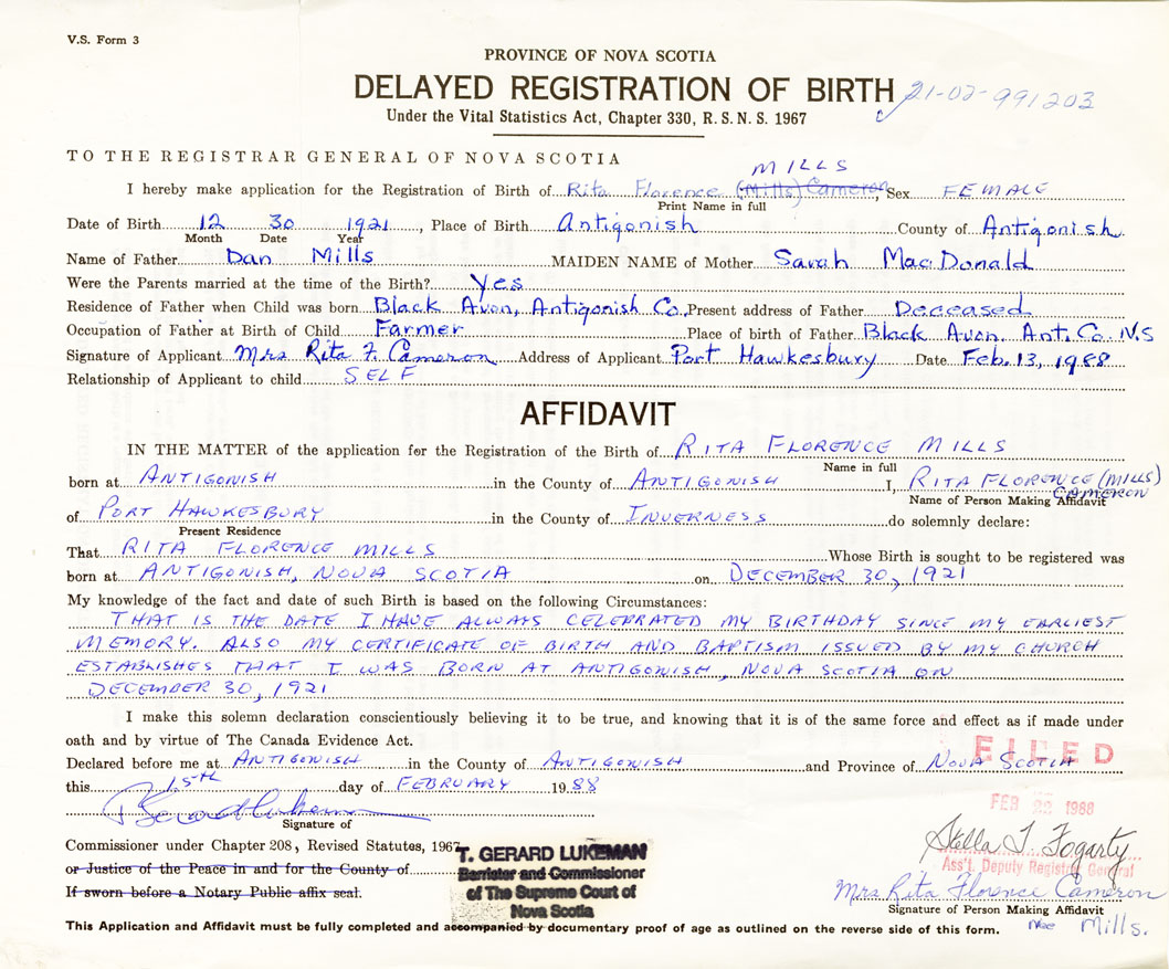 Signature of Applicant Mrs. Rita F. Cameron Address of Applicant Port Hawkesbury Date February 13, 1988