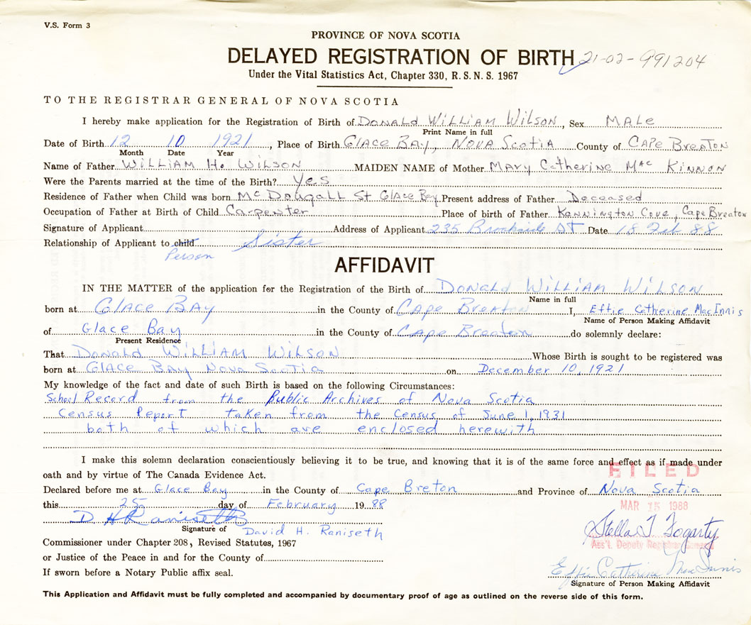 I hereby make application for the Registration of Birth of Donald WilliamWilson Sex Male