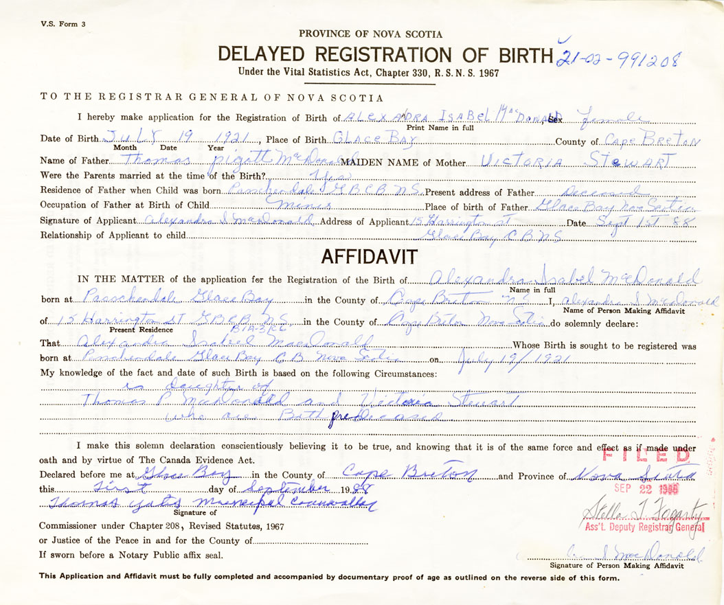 21. Name and Post Office address of Informant Alexandra I MacDonald 15 Harrington St. Glace Bay