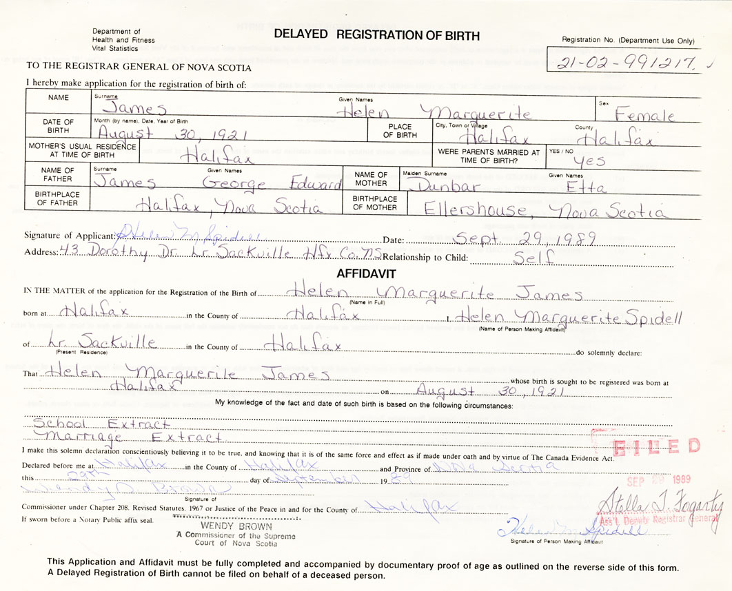 Signature of Applicant Helen M. Spidell Address of Applicant 43 Dorothy Dr. Lower Sackville Date September 29, 1989