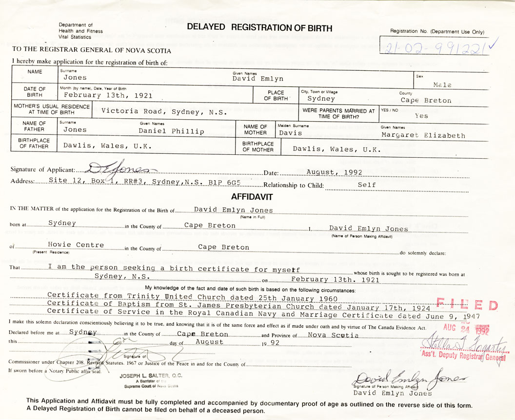 I hereby make application for the Registration of Birth of David EmlynJones Sex Male
